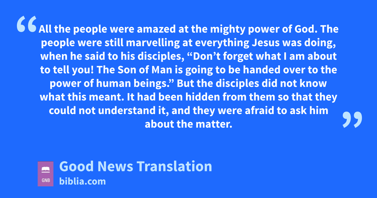 The people were still marvelling at everything Jesus was doing, when he said to his disciples, 44“Don’t forget what I am about to tell you! The Son of Man is going to be handed over to the power of human beings.” 45But the disciples did not know what this meant. It had been hidden from them so that they could not understand it, and they were afraid to ask him about the matter.