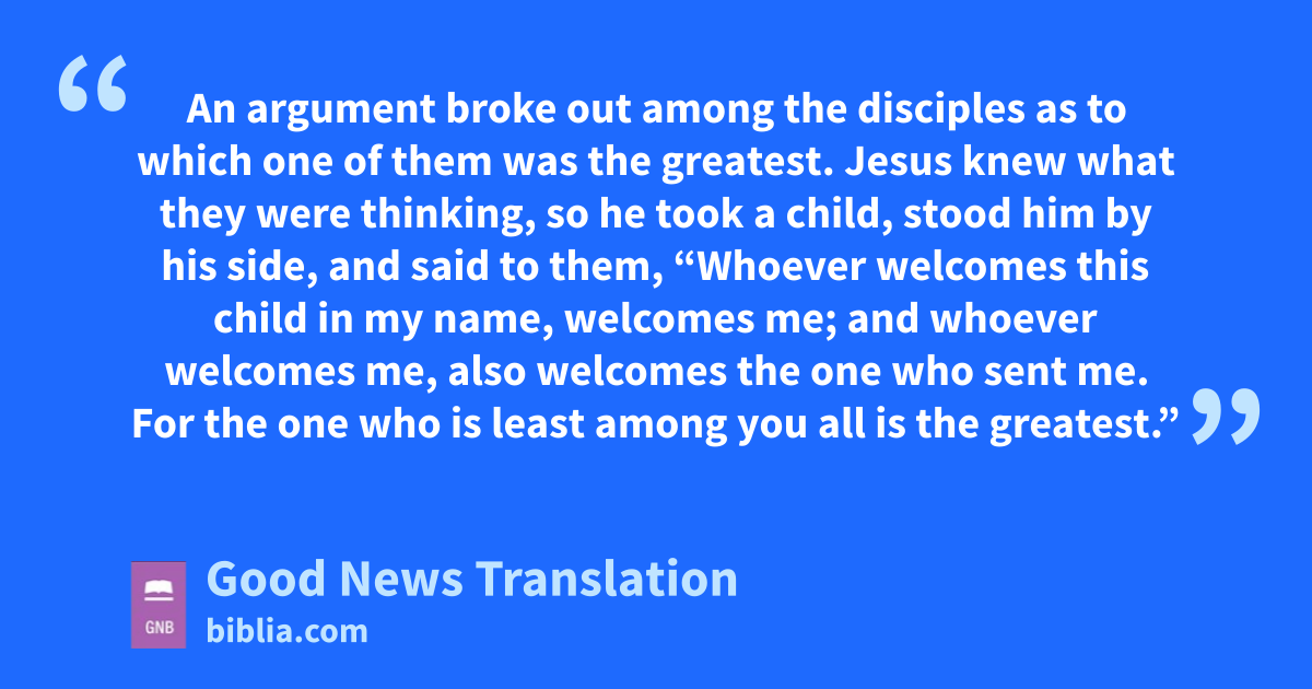 46 *An argument broke out among the disciples as to which one of them was the greatest. 47Jesus knew what they were thinking, so he took a child, stood him by his side, 48*and said to them, “Whoever welcomes this child in my name, welcomes me; and whoever welcomes me, also welcomes the one who sent me. For the one who is least among you all is the greatest.”