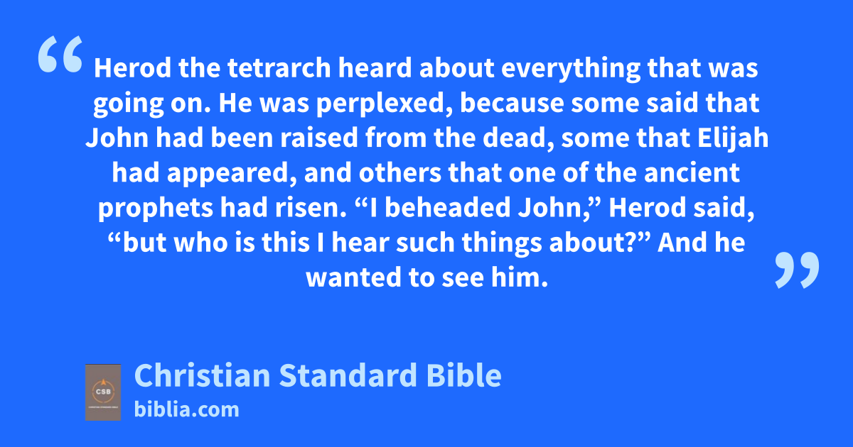 7 Herod the tetrarchac heard about everything that was going on.ad He was perplexed, because some said that John had been raised from the dead, 8 some that Elijah had appeared,ae and others that one of the ancient prophets had risen.af 9 “I beheaded John,” Herod said, “but who is this I hear such things about?” And he wanted to see him.ag