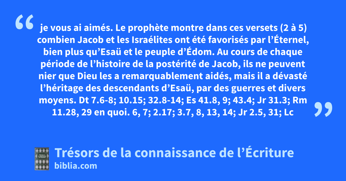 je vous ai aimés. Le prophète montre dans ces versets (2 à 5) combien Jacob et les Israélites ont été favorisés par l’Éternel, bien plus qu’Esaü et le peuple d’Édom. Au cours de chaque période de l’histoire de la postérité de Jacob, ils ne peuvent nier que Dieu les a remarquablement aidés, mais il a dévasté l’héritage des descendants d’Esaü, par des guerres et divers moyens. Dt 7.6-8; 10.15; 32.8-14; Es 41.8, 9; 43.4; Jr 31.3; Rm 11.28, 29 en quoi. 6, 7; 2.17; 3.7, 8, 13, 14; Jr 2.5, 31; Lc 10.29 cependant j’ai aimé Jacob. Gn 25.23; 27.27-30, 33; 28.3, 4, 13, 14; 32.28-30; 48.4; Rm 9.10-13