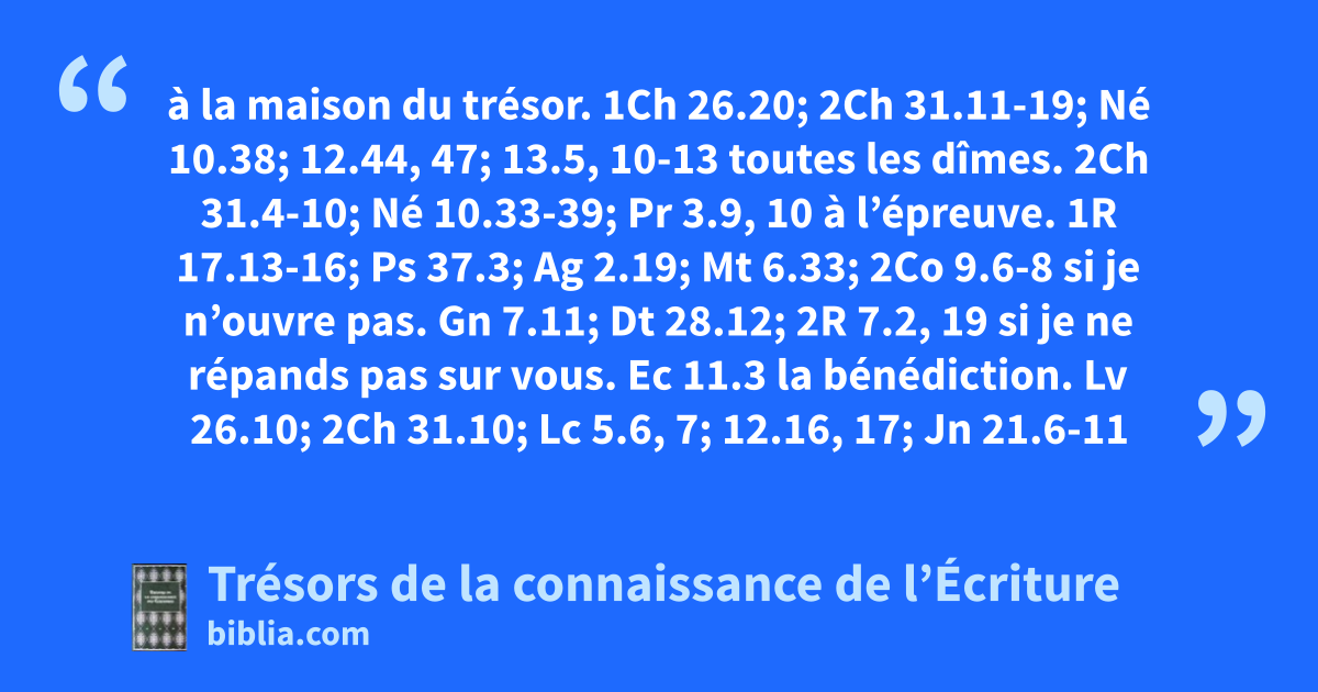 à la maison du trésor. 1Ch 26.20; 2Ch 31.11-19; Né 10.38; 12.44, 47; 13.5, 10-13 toutes les dîmes. 2Ch 31.4-10; Né 10.33-39; Pr 3.9, 10 à l’épreuve. 1R 17.13-16; Ps 37.3; Ag 2.19; Mt 6.33; 2Co 9.6-8 si je n’ouvre pas. Gn 7.11; Dt 28.12; 2R 7.2, 19 si je ne répands pas sur vous. Ec 11.3 la bénédiction. Lv 26.10; 2Ch 31.10; Lc 5.6, 7; 12.16, 17; Jn 21.6-11