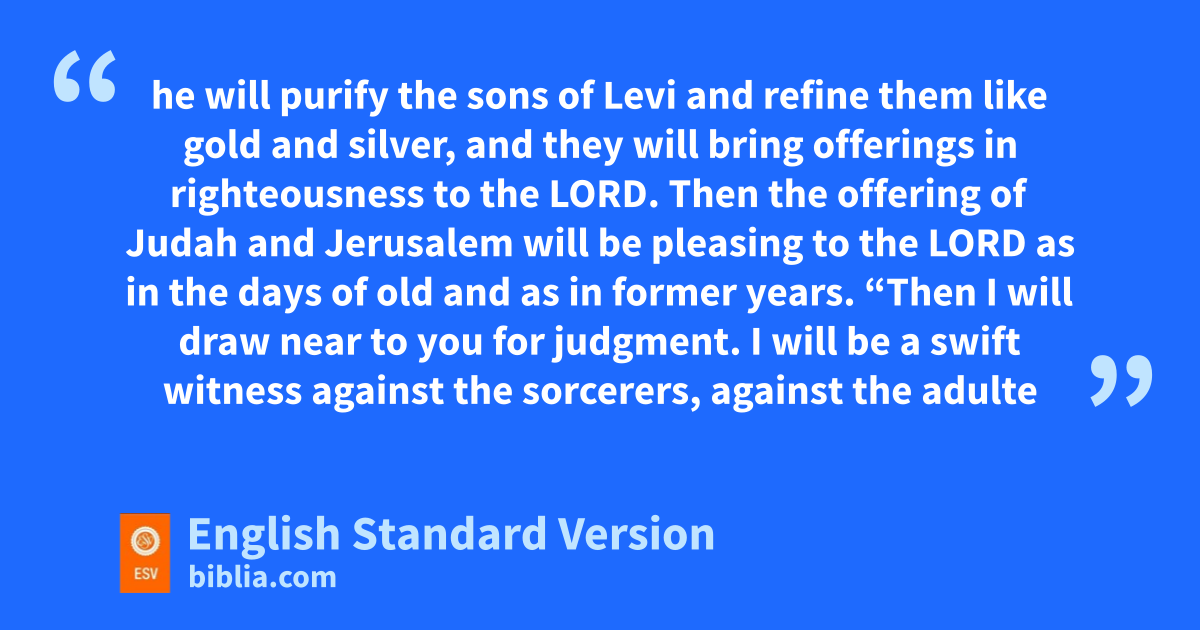 3 g“Behold, I send hmy messenger, and ihe will prepare the way before me. And the Lord jwhom you seek will suddenly come to his temple; and kthe messenger of the covenant in whom you delight, behold, he is coming, says the Lord of hosts. 2 But lwho can endure the day of his coming, and who can stand when he appears? For mhe is like a refiner’s fire and like fullers’ soap. 3 He will sit nas a refiner and purifier of silver, and he will purify the sons of Levi and refine them like gold and silver, and they will bring oofferings in righteousness to the Lord.1 4 pThen the offering of Judah and Jerusalem will be pleasing to the Lord as in the days of old and as in former years.