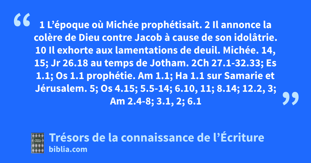 1 L’époque où Michée prophétisait. 2 Il annonce la colère de Dieu contre Jacob à cause de son idolâtrie. 10 Il exhorte aux lamentations de deuil.