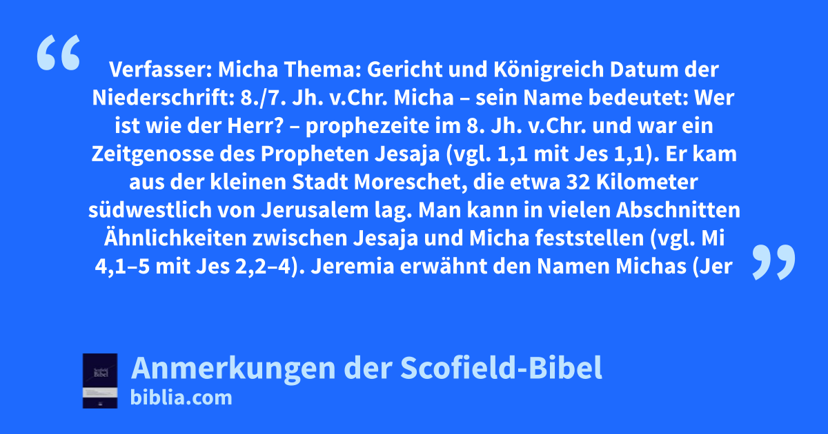 Micha – sein Name bedeutet: Wer ist wie der Herr? – prophezeite im 8. Jh. v.Chr. und war ein Zeitgenosse des Propheten Jesaja (vgl. 1,1 mit Jes 1,1). Er kam aus der kleinen Stadt Moreschet, die etwa 32 Kilometer südwestlich von Jerusalem lag. Man kann in vielen Abschnitten Ähnlichkeiten zwischen Jesaja und Micha feststellen (vgl. Mi 4,1–5 mit Jes 2,2–4). Jeremia erwähnt den Namen Michas (Jer 26,18) und verbindet ihn mit der Regierung des Hiskia, und unser Herr zitiert Mi 7,6 in Mt 10,35.36. Samaria, Jerusalem, ganz Juda, Israel und die Nationen sind Gegenstand der Prophetie Michas. Assur ist die wichtigste ausländische Macht jener Zeit. Die Botschaften wenden sich vor allem an die Hauptstädte Samaria und Jerusalem als die einflussreichen Zentren der Nation. Gott bittet Israel und Juda inständig, sich von ihren Sünden abzuwenden und sich zu ihm zu kehren; er bezeichnet Assur als die Rute seines Zornes (Jes 10,5). Das Buch Micha schließt mit Verheißungen einer zukünftigen Herrlichkeit unter dem Messias und seiner gerechten Regierung.