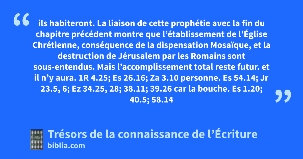 ils habiteront. La liaison de cette prophétie avec la fin du chapitre précédent montre que l’établissement de l’Église Chrétienne, conséquence de la dispensation Mosaïque, et la destruction de Jérusalem par les Romains sont sous-entendus. Mais l’accomplissement total reste futur. et il n’y aura. 1R 4.25; Es 26.16; Za 3.10 personne. Es 54.14; Jr 23.5, 6; Ez 34.25, 28; 38.11; 39.26 car la bouche. Es 1.20; 40.5; 58.14