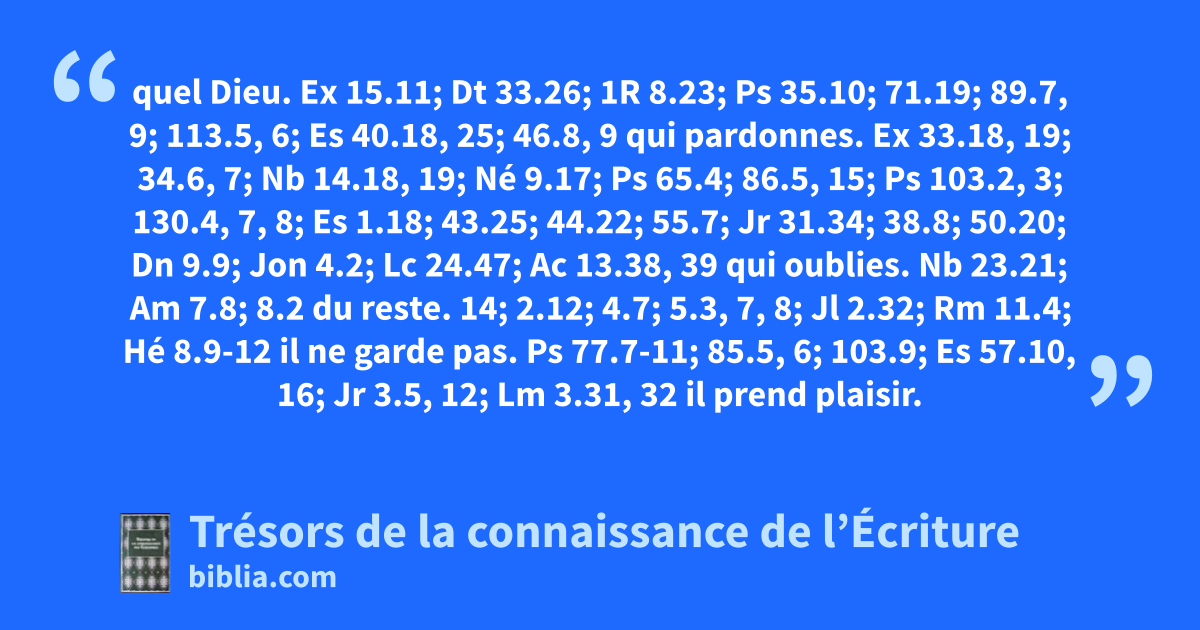 quel Dieu. Ex 15.11; Dt 33.26; 1R 8.23; Ps 35.10; 71.19; 89.7, 9; 113.5, 6; Es 40.18, 25; 46.8, 9 qui pardonnes. Ex 33.18, 19; 34.6, 7; Nb 14.18, 19; Né 9.17; Ps 65.4; 86.5, 15; Ps 103.2, 3; 130.4, 7, 8; Es 1.18; 43.25; 44.22; 55.7; Jr 31.34; 38.8; 50.20; Dn 9.9; Jon 4.2; Lc 24.47; Ac 13.38, 39 qui oublies. Nb 23.21; Am 7.8; 8.2 du reste. 14; 2.12; 4.7; 5.3, 7, 8; Jl 2.32; Rm 11.4; Hé 8.9-12 il ne garde pas. Ps 77.7-11; 85.5, 6; 103.9; Es 57.10, 16; Jr 3.5, 12; Lm 3.31, 32 il prend plaisir. Es 62.5; 65.19; Jr 32.41; Ez 33.11; So 3.17; Lc 15.5-7, 9, 10, 23, 24, 32; Ep 2.4, 5; Jc 2.13