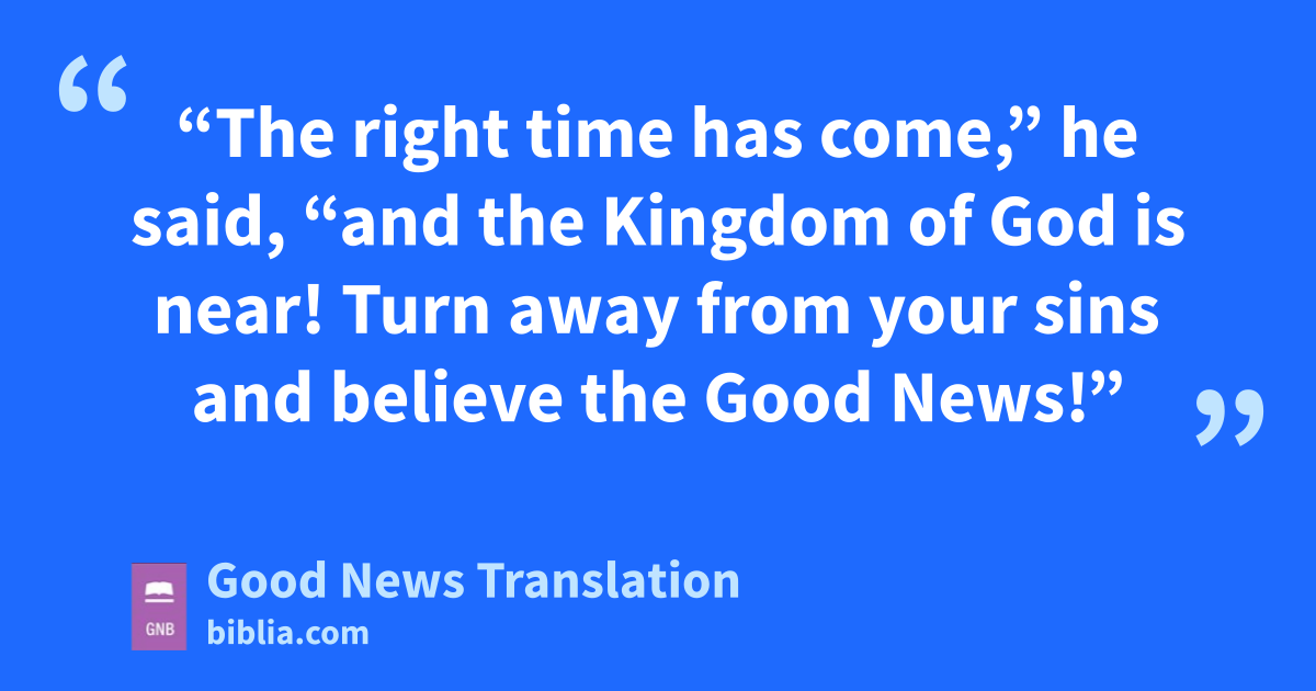 14 After John had been put in prison, Jesus went to Galilee and preached the Good News from God. 15*“The right time has come,” he said, “and the Kingdom of God is near! Turn away from your sins and believe the Good News!”