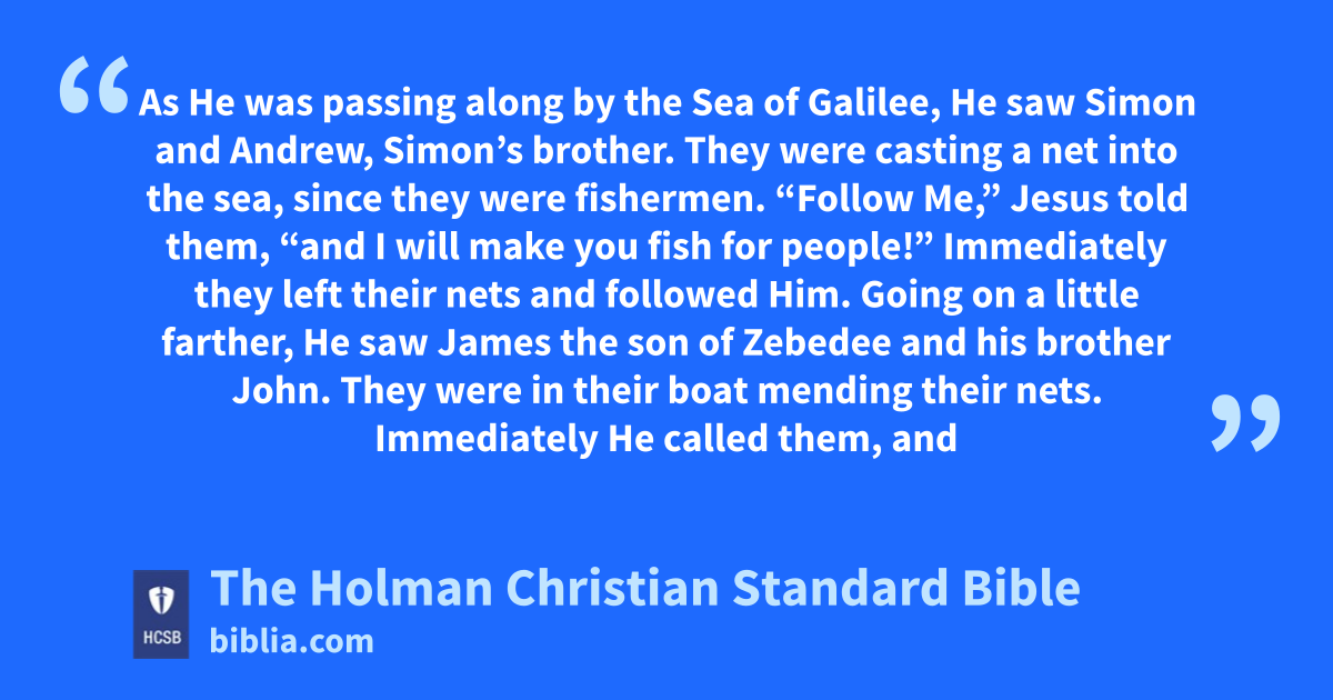 17 “Follow Me,” s Jesus told them, “and I will make you fish for t u people!” v 18 Immediately they left their nets and followed w Him. x 19 Going on a little farther, He saw James y the son of Zebedee z and his brother John. a They were in their boat mending their nets. 20 Immediately He called them, and they left their father Zebedee in the boat with the hired men and followed Him. b