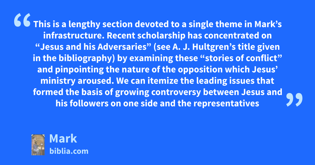 This is a lengthy section devoted to a single theme in Mark’s infrastructure. Recent scholarship has concentrated on “Jesus and his Adversaries” (see A. J. Hultgren’s title given in the bibliography) by examining these “stories of conflict” and pinpointing the nature of the opposition which Jesus’ ministry aroused. We can itemize the leading issues that formed the basis of growing controversy between Jesus and his followers on one side and the representatives