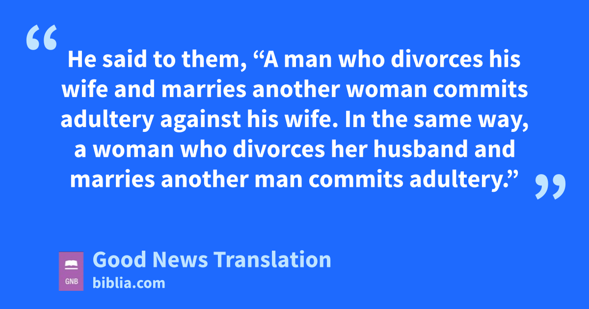 10 When they went back into the house, the disciples asked Jesus about this matter. 11*He said to them, “A man who divorces his wife and marries another woman commits adultery against his wife. 12*In the same way, a woman who divorces her husband and marries another man commits adultery.”