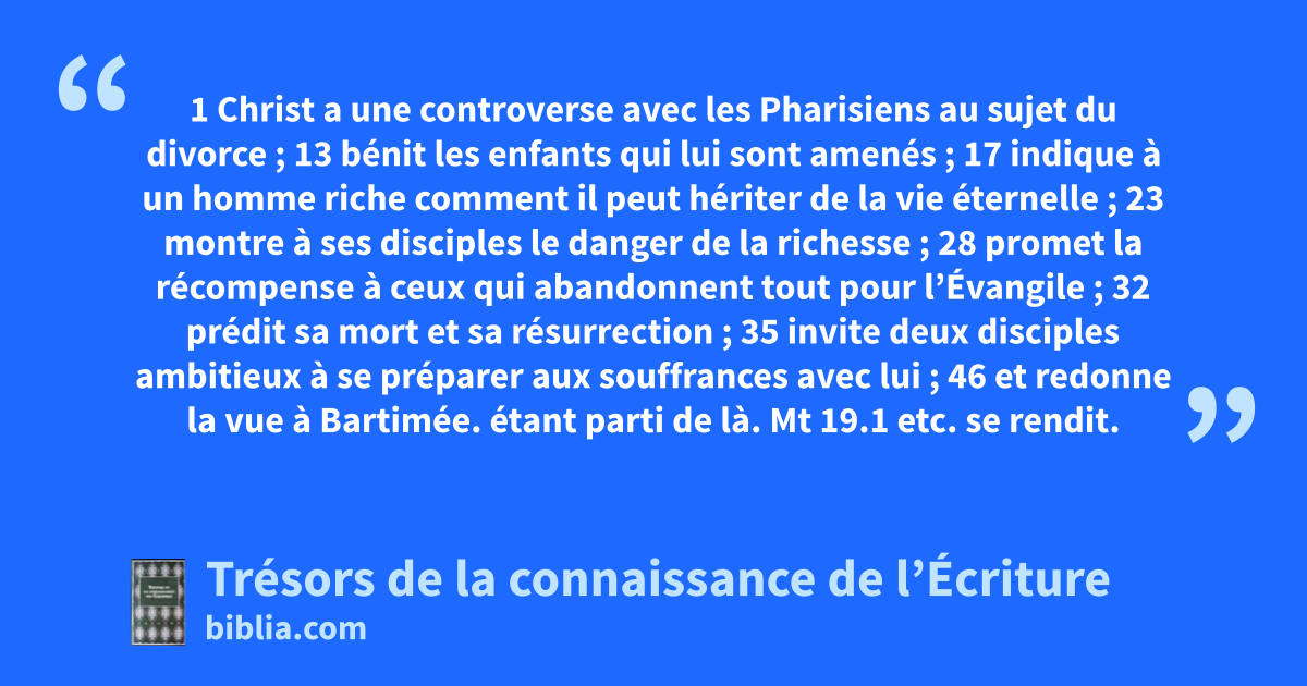 1 Christ a une controverse avec les Pharisiens au sujet du divorce ; 13 bénit les enfants qui lui sont amenés ; 17 indique à un homme riche comment il peut hériter de la vie éternelle ; 23 montre à ses disciples le danger de la richesse ; 28 promet la récompense à ceux qui abandonnent tout pour l’Évangile ; 32 prédit sa mort et sa résurrection ; 35 invite deux disciples ambitieux à se préparer aux souffrances avec lui ; 46 et redonne la vue à Bartimée.