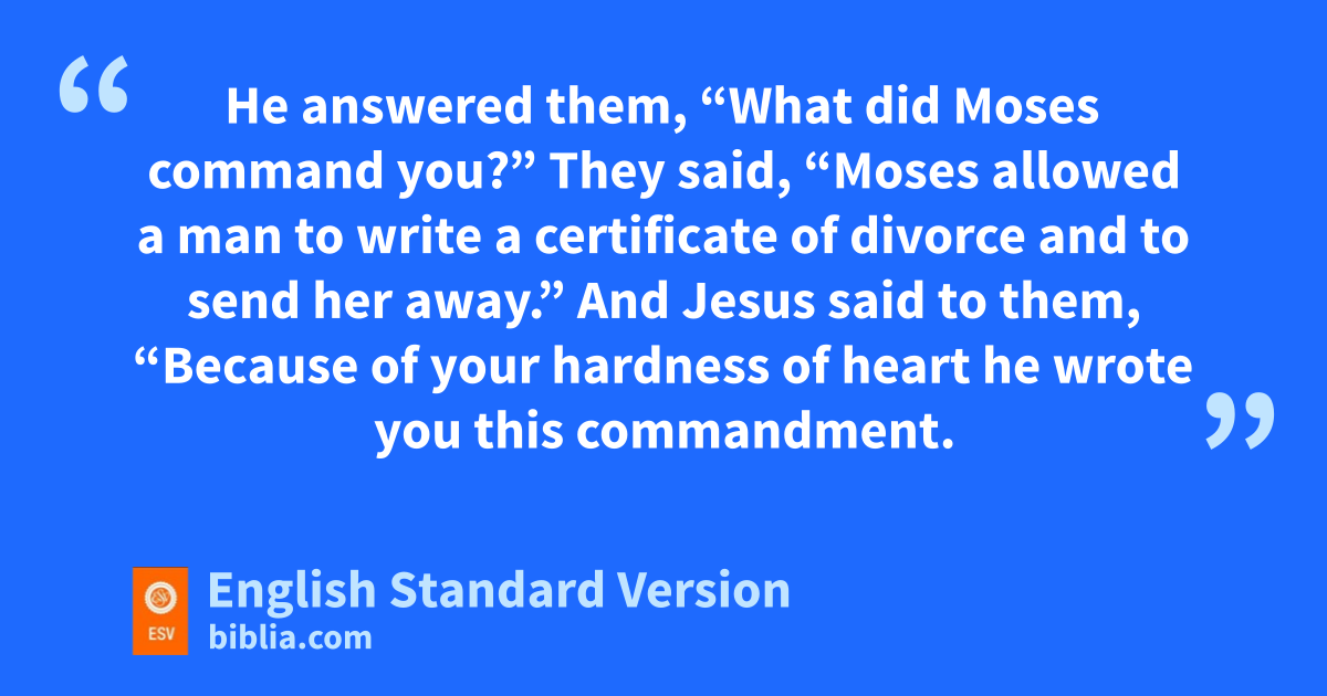 2 And Pharisees came up and in order bto test him asked, c“Is it lawful for a man to divorce his wife?” 3 He answered them, “What did Moses command you?” 4 They said, d“Moses allowed a man to write a certificate of divorce and to send her away.” 5 And Jesus said to them, “Because of your ehardness of heart he wrote you this commandment. 6 But ffrom the beginning of creation, ‘God made them gmale and female.’ 7 h‘Therefore a man shall leave his father and mother and hold fast to his wife,1 8 and ithe two shall become one flesh.’ So they are no longer two but one flesh. 9 jWhat therefore God has joined together, let not man separate.”
