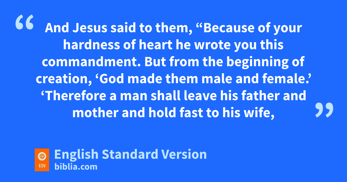 2 And Pharisees came up and in order bto test him asked, c“Is it lawful for a man to divorce his wife?” 3 He answered them, “What did Moses command you?” 4 They said, d“Moses allowed a man to write a certificate of divorce and to send her away.” 5 And Jesus said to them, “Because of your ehardness of heart he wrote you this commandment. 6 But ffrom the beginning of creation, ‘God made them gmale and female.’ 7 h‘Therefore a man shall leave his father and mother and hold fast to his wife,1 8 and ithe two shall become one flesh.’ So they are no longer two but one flesh. 9 jWhat therefore God has joined together, let not man separate.”