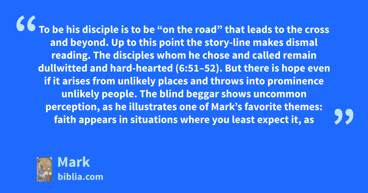 To be his disciple is to be “on the road” that leads to the cross and beyond. Up to this point the story-line makes dismal reading. The disciples whom he chose and called remain dullwitted and hard-hearted (6:51–52). But there is hope even if it arises from unlikely places and throws into prominence unlikely people. The blind beggar shows uncommon perception, as he illustrates one of Mark’s favorite themes: faith appears in situations where you least expect it, as
