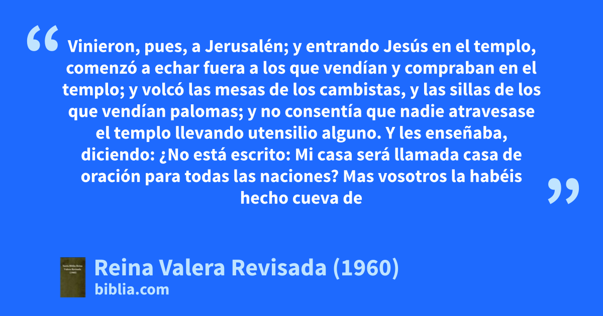 15Vinieron, pues, a Jerusalén; y entrando Jesús en el templo, comenzó a echar fuera a los que vendían y compraban en el templo; y volcó las mesas de los cambistas, y las sillas de los que vendían palomas; 16y no consentía que nadie atravesase el templo llevando utensilio alguno. 17Y les enseñaba, diciendo: ¿No está escrito: Mi casa será llamada casa de oración para todas las nacionesc? Mas vosotros la habéis hecho cueva de ladrones.d 18Y lo oyeron los escribas y los principales sacerdotes, y buscaban cómo matarle; porque le tenían miedo, por cuanto todo el pueblo estaba admirado de su doctrina. 19Pero al llegar la noche, Jesús salió de la ciudad.