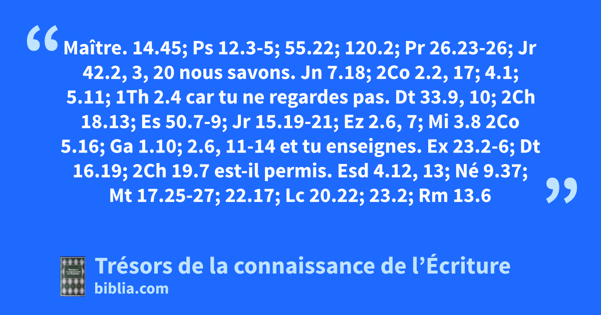 Maître. 14.45; Ps 12.3-5; 55.22; 120.2; Pr 26.23-26; Jr 42.2, 3, 20 nous savons. Jn 7.18; 2Co 2.2, 17; 4.1; 5.11; 1Th 2.4 car tu ne regardes pas. Dt 33.9, 10; 2Ch 18.13; Es 50.7-9; Jr 15.19-21; Ez 2.6, 7; Mi 3.8 2Co 5.16; Ga 1.10; 2.6, 11-14 et tu enseignes. Ex 23.2-6; Dt 16.19; 2Ch 19.7 est-il permis. Esd 4.12, 13; Né 9.37; Mt 17.25-27; 22.17; Lc 20.22; 23.2; Rm 13.6