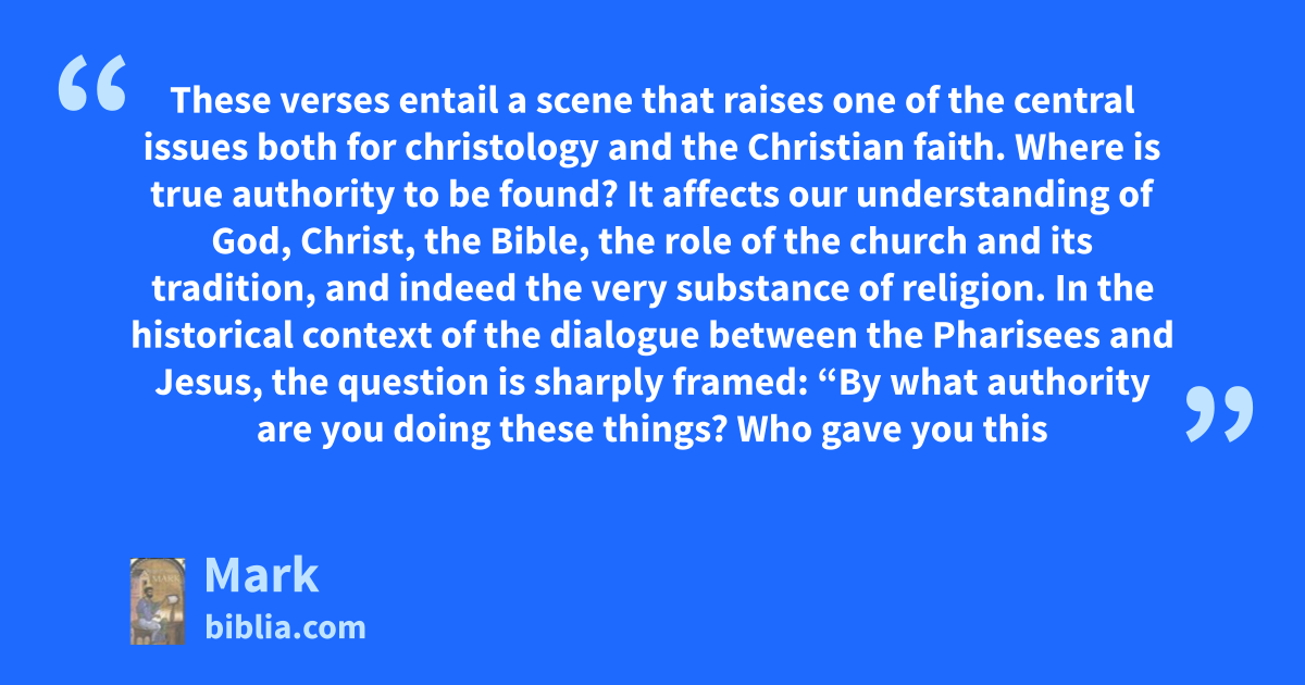 These verses entail a scene that raises one of the central issues both for christology and the Christian faith. Where is true authority to be found? It affects our understanding of God, Christ, the Bible, the role of the church and its tradition, and indeed the very substance of religion. In the historical context of the dialogue between the Pharisees and Jesus, the question is sharply framed: “By what authority are you doing these things? Who gave you this