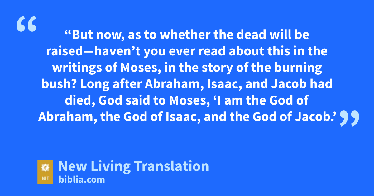 26 “But now, as to whether the dead will be raised—haven’t you ever read about this in the writings of Moses, in the story of the burning bush? Long after Abraham, Isaac, and Jacob had died, God said to Moses,* ‘I am the God of Abraham, the God of Isaac, and the God of Jacob.’* 27 So he is the God of the living, not the dead. You have made a serious error.”