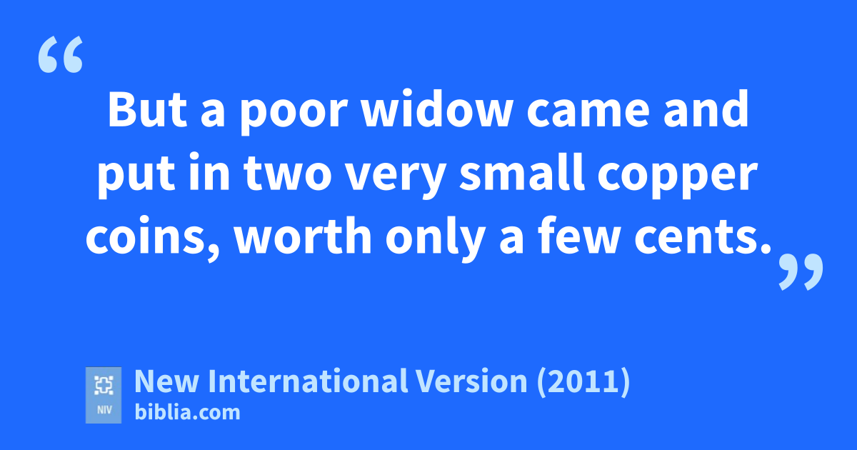 41 Jesus sat down opposite the place where the offerings were puty and watched the crowd putting their money into the temple treasury. Many rich people threw in large amounts. 42 But a poor widow came and put in two very small copper coins, worth only a few cents.