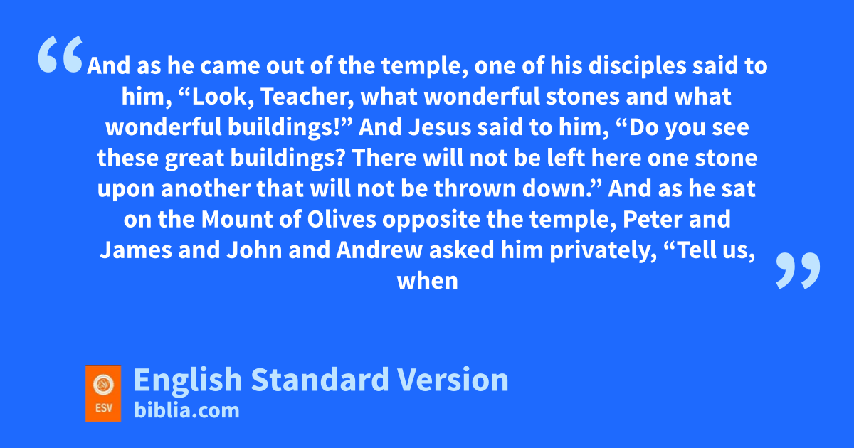 13 yAnd as he came out of the temple, one of his disciples said to him, “Look, Teacher, what wonderful stones and what wonderful buildings!” 2 And Jesus said to him, “Do you see these great buildings? zThere will not be left here one stone upon another that will not be thrown down.”