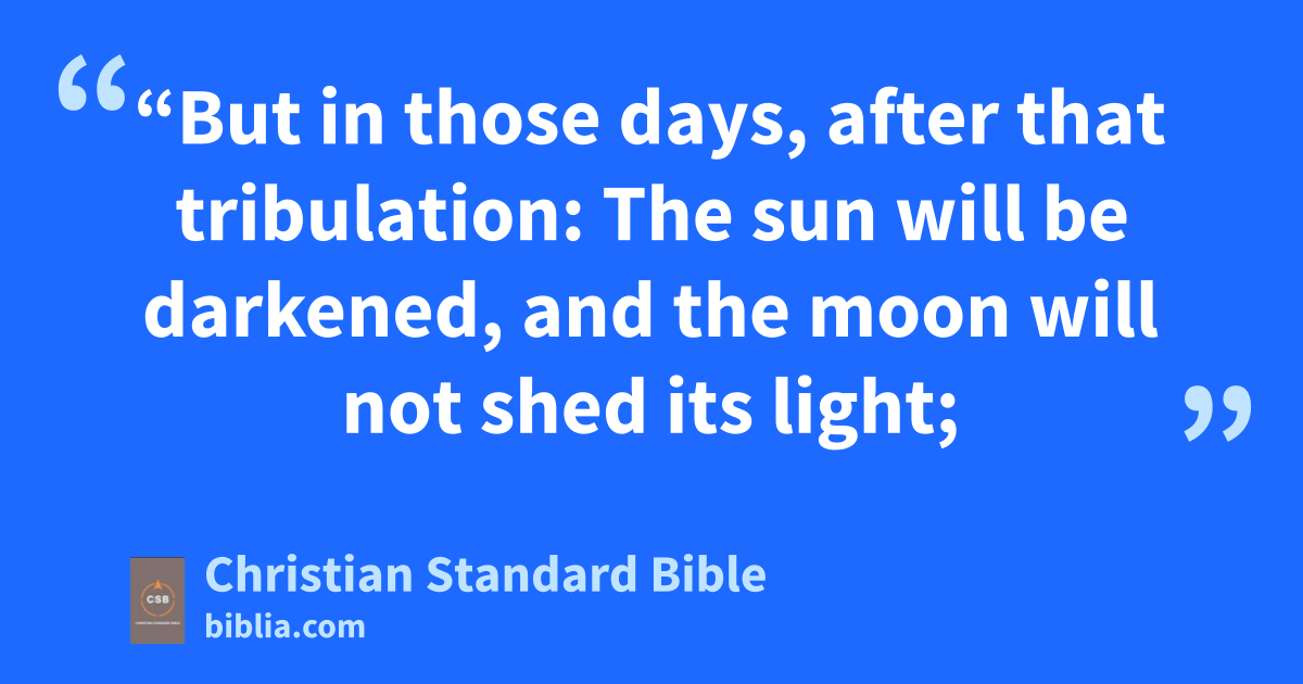 24 “But in those days, after that tribulation:ak The sun will be darkened, and the moon will not shed its light; 25 the starsal will be falling from the sky, and the powers in the heavens will be shaken.am 26 Then they will see the Son of Manan comingao in cloudsap with great poweraq and glory.ar 27 He will send out the angelsas and gather his electat from the four winds, from the ends of the earth to the ends of heaven.au
