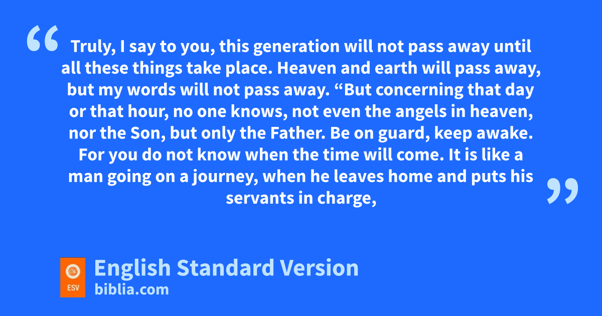 32 “But concerning that day or that hour, ino one knows, not even the angels in heaven, jnor the Son, kbut only the Father. 33 lBe on guard, mkeep awake.1 For you do not know when the time will come. 34 nIt is like a man ogoing on a journey, when he leaves home and puts his servants2 in charge, peach with his work, and commands qthe doorkeeper to stay awake. 35 rTherefore stay awake—for you do not know when the master of the house will come, sin the evening, or sat midnight, or twhen the rooster crows,3 or uin the morning— 36 lest vhe come suddenly and wfind you asleep. 37 And what I say to you I say to all: rStay awake.”