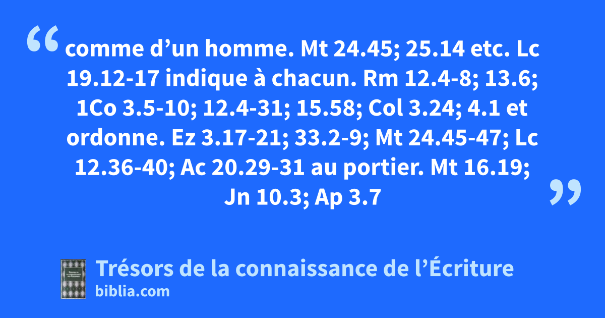 comme d’un homme. Mt 24.45; 25.14 etc. Lc 19.12-17 indique à chacun. Rm 12.4-8; 13.6; 1Co 3.5-10; 12.4-31; 15.58; Col 3.24; 4.1 et ordonne. Ez 3.17-21; 33.2-9; Mt 24.45-47; Lc 12.36-40; Ac 20.29-31 au portier. Mt 16.19; Jn 10.3; Ap 3.7