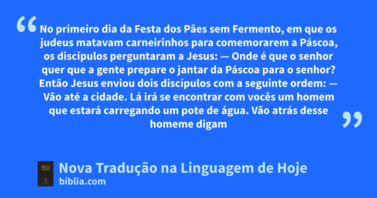 — Vão até a cidade. Lá irá se encontrar com vocês um homem que estará carregando um pote de água. Vão atrás desse homem14 e digam ao dono da casa em que ele entrar que o Mestre manda perguntar: “Onde fica a sala em que eu e os meus discípulos vamos comer o jantar da Páscoa?”15 Então ele mostrará a vocês no andar de cima uma sala grande, mobiliada e arrumada para o jantar. Preparem ali tudo para nós.