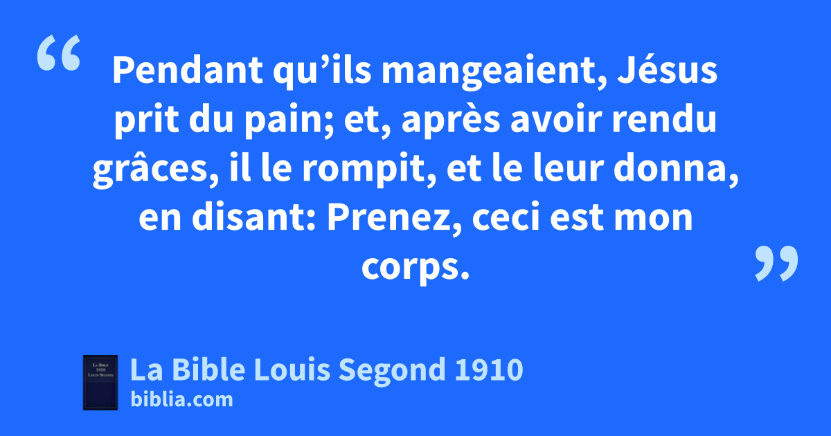 22iPendant qu’ils mangeaient, Jésus prit du pain; et, après avoir rendu grâces, il le rompit, et le leur donna, en disant: Prenez, ceci est mon corps. 23Il prit ensuite une coupe; et, après avoir rendu grâces, il la leur donna, et ils en burent tous. 24Et il leur dit: Ceci est mon sang, le sang de l’alliance, qui est répandu pour plusieurs.