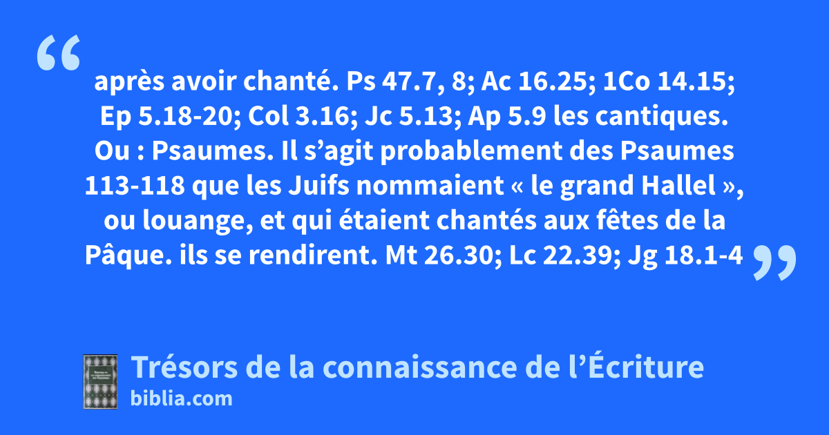 après avoir chanté. Ps 47.7, 8; Ac 16.25; 1Co 14.15; Ep 5.18-20; Col 3.16; Jc 5.13; Ap 5.9 les cantiques. Ou : Psaumes. Il s’agit probablement des Psaumes 113-118 que les Juifs nommaient « le grand Hallel », ou louange, et qui étaient chantés aux fêtes de la Pâque. ils se rendirent. Mt 26.30; Lc 22.39; Jg 18.1-4