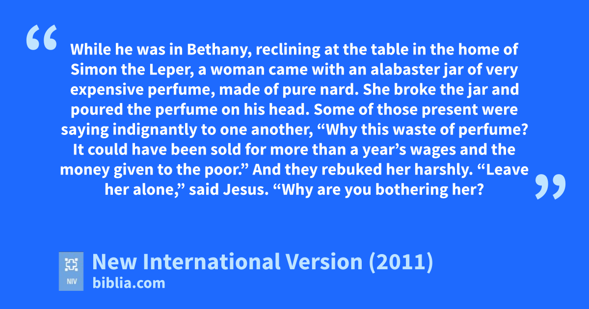 6 “Leave her alone,” said Jesus. “Why are you bothering her? She has done a beautiful thing to me. 7 The poor you will always have with you,b and you can help them any time you want.f But you will not always have me. 8 She did what she could. She poured perfume on my body beforehand to prepare for my burial.g 9 Truly I tell you, wherever the gospel is preached throughout the world,h what she has done will also be told, in memory of her.”