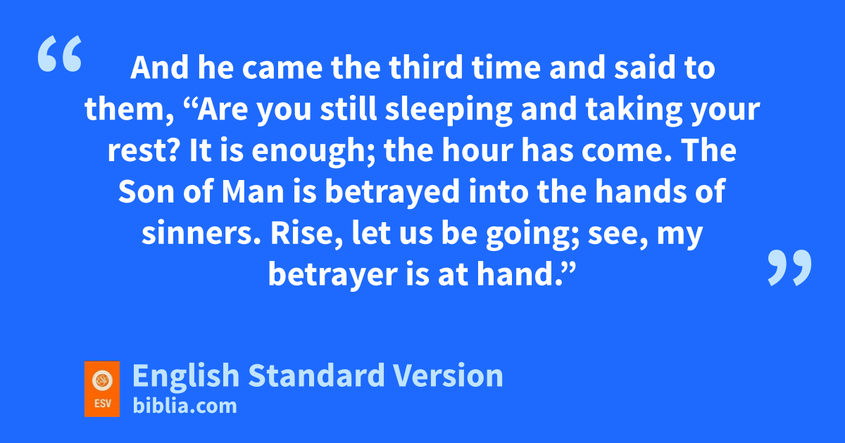 32 sAnd they went kto a place called Gethsemane. And he said to his disciples, “Sit here while I pray.” 33 And he took with him tPeter and James and John, and began uto be greatly distressed and troubled. 34 And he said to them, v“My soul is very sorrowful, even to death. Remain here and wwatch.”4 35 And going a little farther, he fell on the ground xand prayed that, if it were possible, ythe hour might pass from him. 36 And he said, z“Abba, Father, aall things are possible for you. Remove bthis cup from me. cYet not what I will, but what you will.” 37 And he came and found them sleeping, and he said to Peter, “Simon, are you asleep? Could you not watch one hour? 38 wWatch and dpray that you may not eenter into temptation. The spirit indeed is willing, but the flesh is weak.” 39 And again he went away and prayed, fsaying the same words. 40 And again he came and found them sleeping, for gtheir eyes were very heavy, and hthey did not know what to answer him. 41 And he came the third time and said to them, “Are you still sleeping and taking your rest? iIt is enough; jthe hour has come. kThe Son of Man is betrayed into the hands of sinners. 42 Rise, let us be going; see, my betrayer is at hand.”