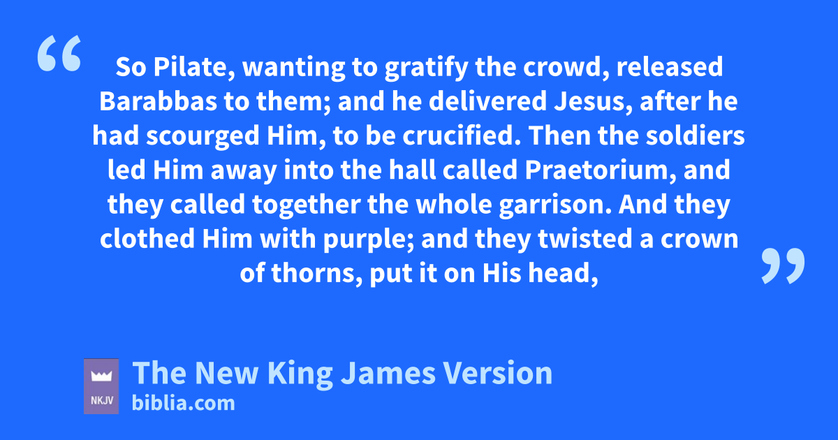 16 mThen the soldiers led Him away into the hall called 3Praetorium, and they called together the whole garrison. 17 And they clothed Him with purple; and they twisted a crown of thorns, put it on His head, 18 and began to salute Him, “Hail, King of the Jews!” 19 Then they nstruck Him on the head with a reed and spat on Him; and bowing the knee, they worshiped Him. 20 And when they had omocked Him, they took the purple off Him, put His own clothes on Him, and led Him out to crucify Him.
