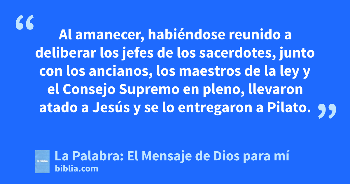 15 Al amanecer, habiéndose reunido a deliberar los jefes de los sacerdotes, junto con los ancianos, los maestros de la ley y el Consejo Supremo en pleno, llevaron atado a Jesús y se lo entregaron a Pilato. 2 Pilato le preguntó: