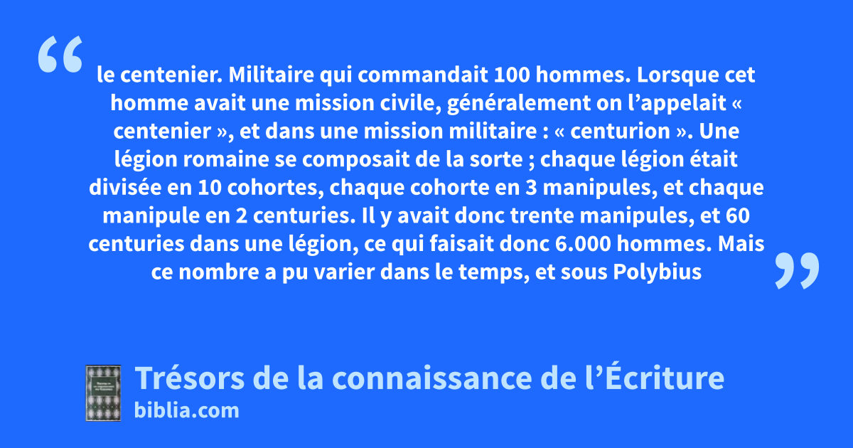 le centenier. Militaire qui commandait 100 hommes. Lorsque cet homme avait une mission civile, généralement on l’appelait « centenier », et dans une mission militaire : « centurion ». Une légion romaine se composait de la sorte ; chaque légion était divisée en 10 cohortes, chaque cohorte en 3 manipules, et chaque manipule en 2 centuries. Il y avait donc trente manipules, et 60 centuries dans une légion, ce qui faisait donc 6.000 hommes. Mais ce nombre a pu varier dans le temps, et sous Polybius il était de 4.200 hommes. L’ordre de bataille se faisait sur 3 lignes : — Les « hastati », ou lanciers, étaient en tête. — Les « principes », le gros de la troupe, venaient en second. — Puis les « triarii », aussi appelés « pilani », à cause de leur arme : le « pilum », lourd javelot romain. Les centurions étaient rémunérés par les tribuns, et très souvent sélectionnés parmi les soldats, selon leurs mérites. Parfois ce poste était obtenu à prix d’argent, ou selon la faveur des consuls. Leur insigne était un cep de vigne, ou un arbuste. 44; Mt 8.5-10; Ac 10.1; 27.1-3, 43 dit. Mt 27.43, 54; Lc 23.47, 48