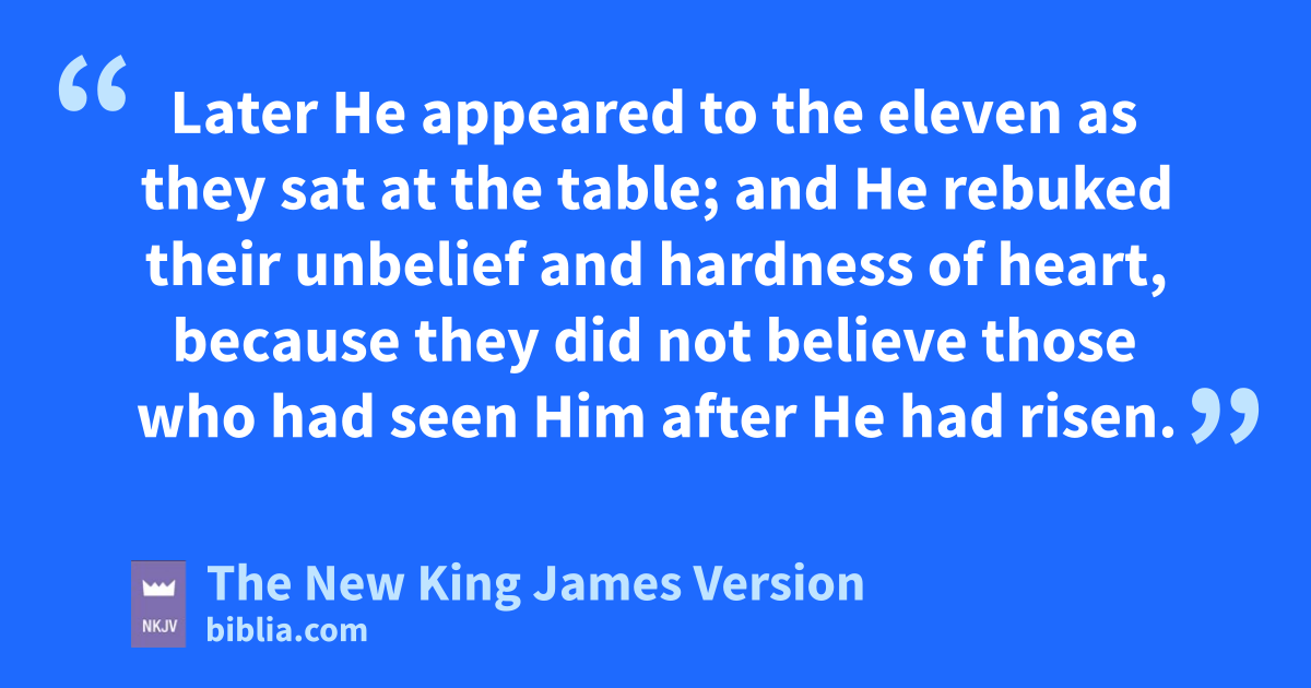 14 lLater He appeared to the eleven as they sat at the table; and He rebuked their unbelief and hardness of heart, because they did not believe those who had seen Him after He had risen. 15 mAnd He said to them, “Go into all the world nand preach the gospel to every creature. 16 oHe who believes and is baptized will be saved; pbut he who does not believe will be condemned. 17 And these qsigns will follow those who 4believe: rIn My name they will cast out demons; sthey will speak with new tongues; 18 tthey 5will take up serpents; and if they drink anything deadly, it will by no means hurt them; uthey will lay hands on the sick, and they will recover.”