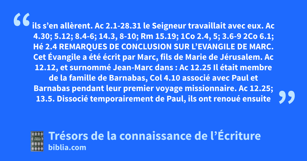 Cet Évangile a été écrit par Marc, fils de Marie de Jérusalem. Ac 12.12, et surnommé Jean-Marc dans : Ac 12.25 Il était membre de la famille de Barnabas, Col 4.10 associé avec Paul et Barnabas pendant leur premier voyage missionnaire. Ac 12.25; 13.5. Dissocié temporairement de Paul, ils ont renoué ensuite leur amitié. 2Tm 4.11. On reconnaît généralement que Pierre a pu fournir ou suggérer la majeure partie du contenu de ce livre. Il semble que l’auteur pensait aux chrétiens gentils quand il a composé ce livre, car il contient peu de références aux prophéties de l’Ancien Testament, et il contient des explications des paroles et des coutumes juives. 3.17; 5.41; 7.1-4, 11, 34. Dans cet Évangile il nous est montré Christ serviteur inlassable de Dieu et de l’homme. Même lorsqu’il voulait se reposer on le recherchait. 6.31-34. On trouve maintes fois dans ce livre le mot ‘aussitôt’. Cet évangile est le plus court, mais d’un style vivant et pittoresque, avec une foule de détails que l’on ne rencontre pas ailleurs. L’auteur fait très souvent allusion aux sentiments humains de Christ : déçu, fatigué, étonné, rempli d’affection. Il parle peu des discours de Jésus, mais insiste sur ses œuvres puissantes.