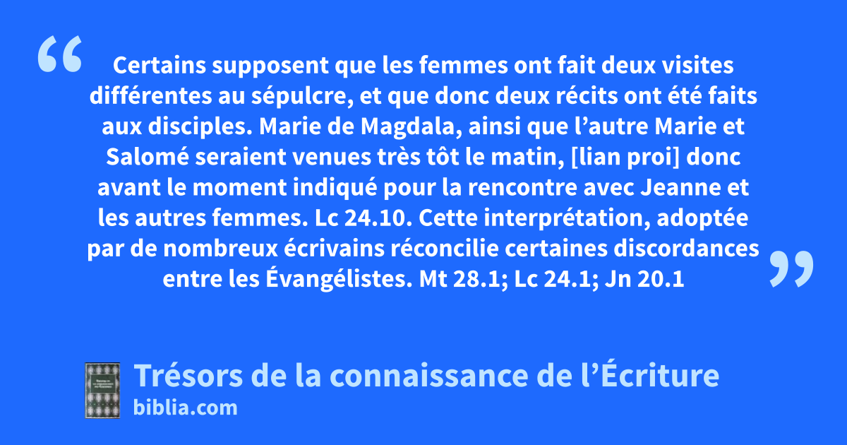Certains supposent que les femmes ont fait deux visites différentes au sépulcre, et que donc deux récits ont été faits aux disciples. Marie de Magdala, ainsi que l’autre Marie et Salomé seraient venues très tôt le matin, [lian proi] donc avant le moment indiqué pour la rencontre avec Jeanne et les autres femmes. Lc 24.10. Cette interprétation, adoptée par de nombreux écrivains réconcilie certaines discordances entre les Évangélistes. Mt 28.1; Lc 24.1; Jn 20.1