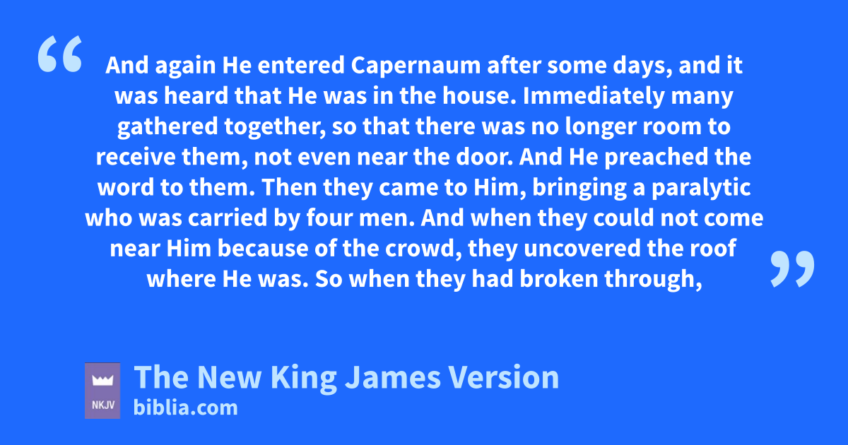 2 And again aHe entered Capernaum after some days, and it was heard that He was in the house. 2 1Immediately many gathered together, so that there was no longer room to receive them, not even near the door. And He preached the word to them. 3 Then they came to Him, bringing a bparalytic who was carried by four men. 4 And when they could not come near Him because of the crowd, they uncovered the roof where He was. So when they had broken through, they let down the bed on which the paralytic was lying.