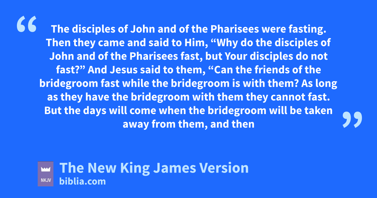 19 And Jesus said to them, “Can the 5friends of the bridegroom fast while the bridegroom is with them? As long as they have the bridegroom with them they cannot fast. 20 But the days will come when the bridegroom will be mtaken away from them, and then they will fast in those days. 21 No one sews a piece of unshrunk cloth on an old garment; or else the new piece pulls away from the old, and the tear is made worse. 22 And no one puts new wine into old wineskins; or else the new wine bursts the wineskins, the wine is spilled, and the wineskins are ruined. But new wine must be put into new wineskins.”
