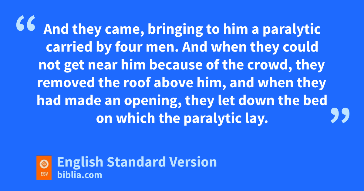 2 And when he returned to tCapernaum after some days, it was reported that he was at home. 2 And many were gathered together, so that there was no more room, not even at the door. And he was preaching the word to them. 3 uAnd they came, bringing to him a paralytic carried by four men. 4 And when they could not get near him because of the crowd, vthey removed the roof above him, and when they had made an opening, they let down the bed on which the paralytic lay. 5 And when Jesus wsaw their faith, he said to the paralytic, “Son, xyour sins are forgiven.” 6 Now some of the scribes were sitting there, questioning in their hearts, 7 “Why does this man speak like that? yHe is blaspheming! zWho can forgive sins but God alone?” 8 And immediately Jesus, aperceiving in his spirit that they thus questioned within themselves, said to them, “Why do you question these things in your hearts? 9 Which is easier, to say to the paralytic, ‘Your sins are forgiven,’ or to say, ‘Rise, take up your bed and walk’? 10 But that you may know that bthe Son of Man has authority on earth to forgive sins”—he said to the paralytic— 11 “I say to you, rise, pick up your bed, and go home.” 12 And he rose and immediately picked up his bed and went out before them all, so that they were all amazed and cglorified God, saying, “We never saw anything like this!”