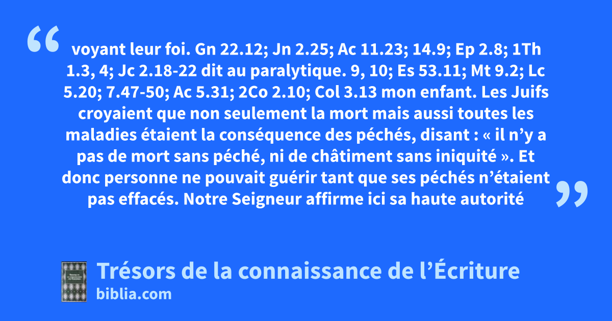 voyant leur foi. Gn 22.12; Jn 2.25; Ac 11.23; 14.9; Ep 2.8; 1Th 1.3, 4; Jc 2.18-22 dit au paralytique. 9, 10; Es 53.11; Mt 9.2; Lc 5.20; 7.47-50; Ac 5.31; 2Co 2.10; Col 3.13 mon enfant. Les Juifs croyaient que non seulement la mort mais aussi toutes les maladies étaient la conséquence des péchés, disant : « il n’y a pas de mort sans péché, ni de châtiment sans iniquité ». Et donc personne ne pouvait guérir tant que ses péchés n’étaient pas effacés. Notre Seigneur affirme ici sa haute autorité en déclarant pardonner les péchés, puis en guérissant le paralytique. 5.34; Mt 9.22; Lc 8.48 tes péchés. Jb 33.17-26; Ps 32.1-5; 90.7-9; 103.3; Es 38.17; Jn 5.14 1Co 11.30; Jc 5.15