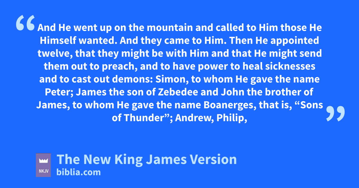 13 nAnd He went up on the mountain and called to Him those He Himself wanted. And they came to Him. 14 Then He appointed twelve, 4that they might be with Him and that He might send them out to preach, 15 and to have 5power 6to heal sicknesses and to cast out demons: 16 7Simon, oto whom He gave the name Peter; 17 James the son of Zebedee and John the brother of James, to whom He gave the name Boanerges, that is, “Sons of Thunder”; 18 Andrew, Philip, Bartholomew, Matthew, Thomas, James the son of Alphaeus, Thaddaeus, Simon the Cananite; 19 and Judas Iscariot, who also betrayed Him. And they went into a house.