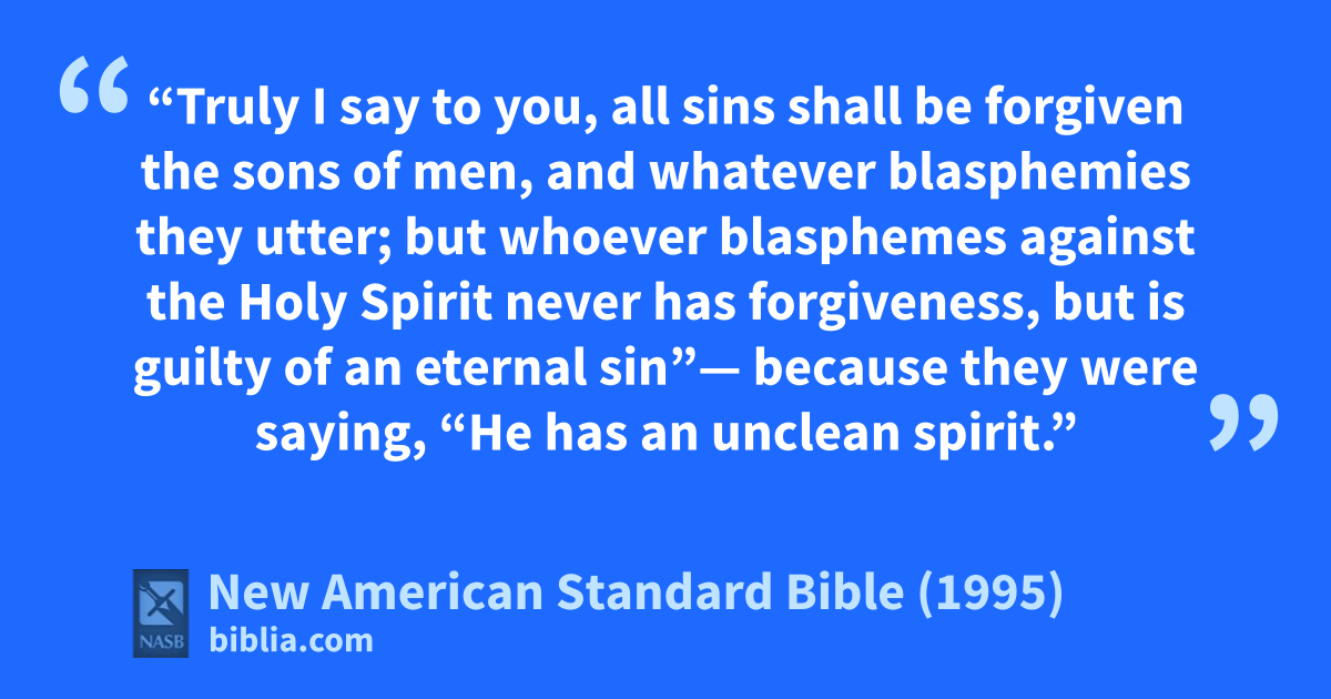 29 but awhoever blasphemes against the Holy Spirit never has forgiveness, but is guilty of an eternal sin”—