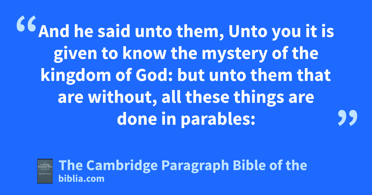 10 And when he was alone, they that were about him with the twelve asked of him the parable. 11 And he said unto them, Unto you it is given to know the mystery of the kingdom of God: but unto dthem that are without, all these things are done in parables: 12 ethat seeing they may see, and not perceive; and hearing they may hear, and not understand; lest at any time they should be converted, and their sins should be forgiven them. 13 fAnd he said unto them, Know ye not this parable? and how then will you know all parables? 14 The sower soweth the word. 15 And these are they by the way side, where the word is sown; but when they have heard, Satan cometh immediately, and taketh away the word that was sown in their hearts. 16 And these are they likewise which are sown on stony ground; who, when they have heard the word, immediately receive it with gladness; 17 and have no root in themselves, and so endure but for a time; afterward, when affliction or persecution ariseth for the word’s sake, immediately they are offended. 18 And these are they which are sown among thorns; such as hear the word, 19 and the cares of this world, and the deceitfulness of riches, and the lusts of other things entering in, choke the word, and it becometh unfruitful. 20 And these are they which are sown on good ground; such as hear the word, and receive it, and bring forth fruit, some thirtyfold, some sixty, and some an hundred.