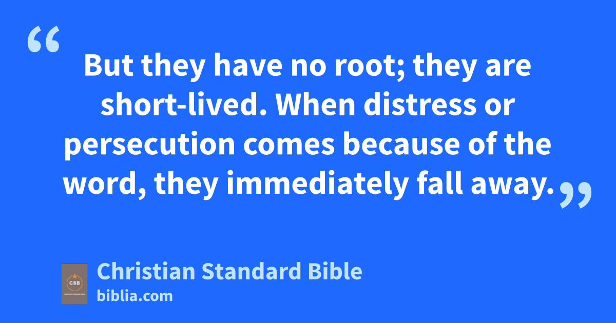 13 Thenat he said to them, “Don’t you understand this parable?au How then will you understand all of the parables? 14 The sower sowsav the word.aw 15 Some are like the word sown on the path.ax When they hear, immediately Satanay comes and takes away the wordaz sown in them.C 16 And others are like seed sown on rocky ground. When they hear the word, immediately they receive it with joy.ba 17 But they have no root; they are short-lived. When distressbb or persecution comes because of the word, they immediately fall away.bc 18 Others are like seed sown among thorns; these are the ones who hear the word, 19 but the worriesbd of this age,be the deceitfulnessD,bf of wealth,bg and the desiresbh for other things enter in and choke the word, and it becomes unfruitful.bi 20 And those like seed sown on good ground hear the word,bj welcome it, and produce fruitbk thirty, sixty, and a hundred times what was sown.”