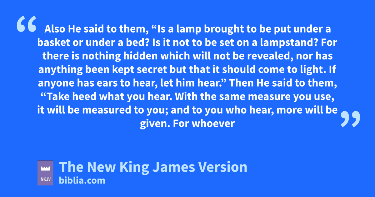 21 kAlso He said to them, “Is a lamp brought to be put under a basket or under a bed? Is it not to be set on a lampstand? 22 lFor there is nothing hidden which will not be revealed, nor has anything been kept secret but that it should come to light. 23 mIf anyone has ears to hear, let him hear.”