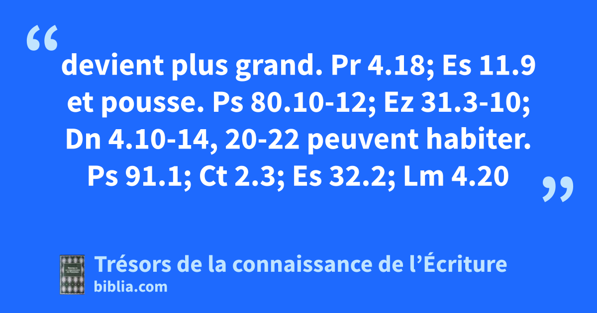 devient plus grand. Pr 4.18; Es 11.9 et pousse. Ps 80.10-12; Ez 31.3-10; Dn 4.10-14, 20-22 peuvent habiter. Ps 91.1; Ct 2.3; Es 32.2; Lm 4.20