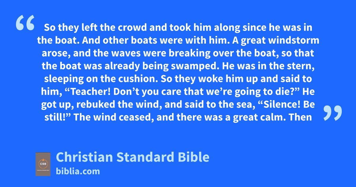 35 Onx that day, when evening had come, he told them, “Let’s cross over to the other side of the sea.” 36 So they left the crowd and took him along since he was in the boat. And other boats were with him. 37 A great windstormy arose, and the wavesz were breaking over the boat, so that the boat was already being swamped. 38 He was in the stern, sleepingaa on the cushion. So they woke him upab and said to him, “Teacher! Don’t you care that we’re going to die?”ac