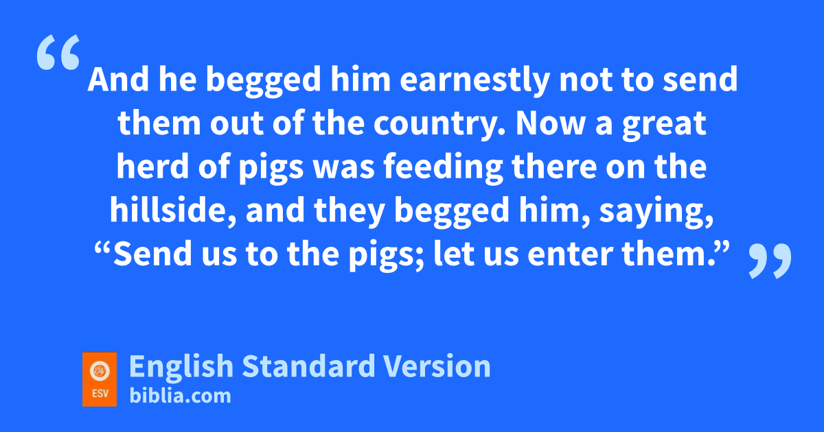 5 uThey came to the other side of the sea, to the country of the Gerasenes.1 2 And when Jesus2 had stepped out of the boat, immediately there met him out of the tombs a man with an unclean spirit. 3 vHe lived among the tombs. And no one could bind him anymore, not even with a chain, 4 for he had often been bound with shackles and chains, but he wrenched the chains apart, and he broke the shackles in pieces. No one had the strength to subdue him. 5 Night and day among the tombs and on the mountains he was always crying out and cutting himself with stones. 6 And when he saw Jesus from afar, he ran and wfell down before him. 7 And xcrying out with a loud voice, he said, “What have you to do with me, Jesus, ySon of zthe Most High God? aI adjure you by God, do not torment me.” 8 For he was saying to him, “Come out of the man, you unclean spirit!” 9 And Jesus asked him, “What is your name?” He replied, “My name is bLegion, for we are many.” 10 And he begged him earnestly not to send them out of the country. 11 Now a great herd of pigs was feeding there on the hillside, 12 and they begged him, saying, “Send us to the pigs; let us enter them.” 13 So he gave them permission. And the unclean spirits came out and entered the pigs; and the herd, numbering about two thousand, rushed down the steep bank into the sea and drowned in the sea.
